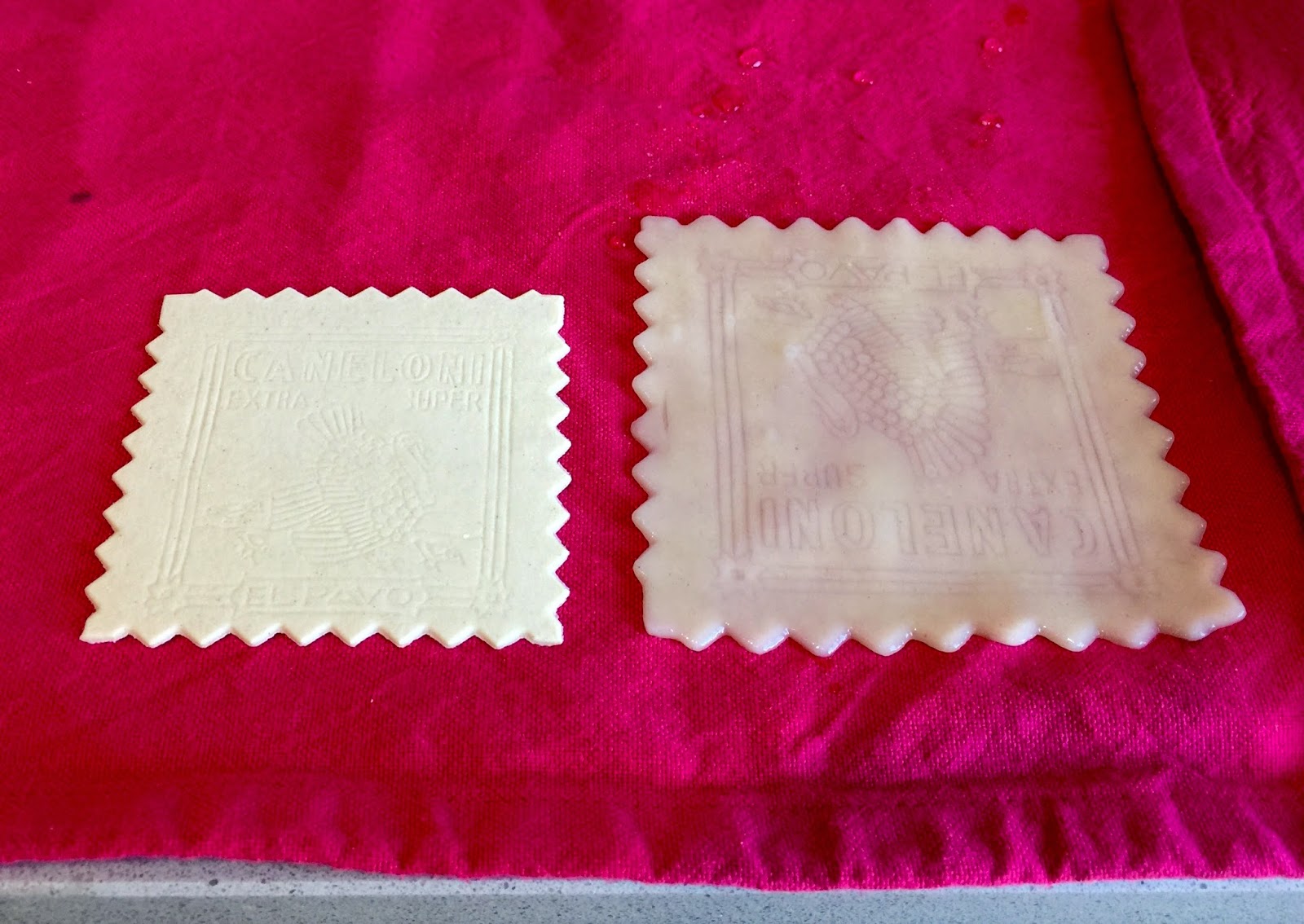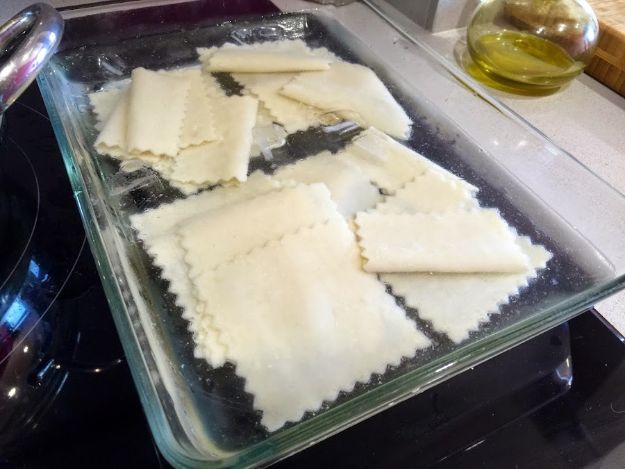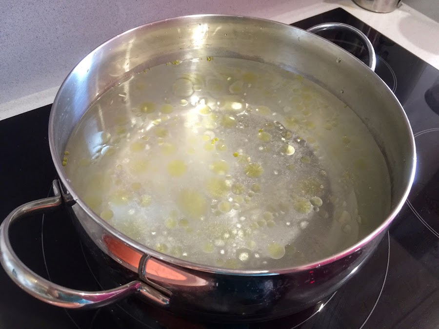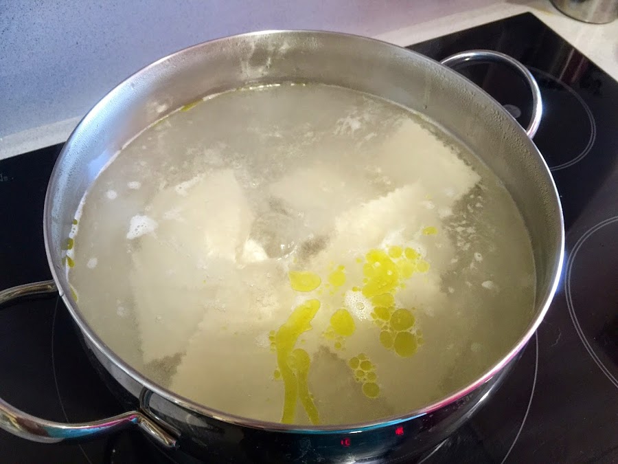 13. Ponemos en una olla grande el agua con un puñadito de sal y un chorrito de aceite. Esperamos a que hierva para añadir las placas de pasta del canalón. Para evitar que se peguen, vale mas que lo hagáis en dos tandas, 20 y 20. Hervir durante 12-15 minutos, según indica el fabricante.