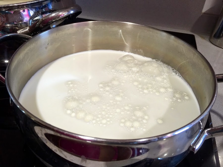 16. Para la bechamel usaremos leche entera fresca. No conviene que la leche esté fría, así que la pondremos en una olla a fuego medio y la iremos calentando.