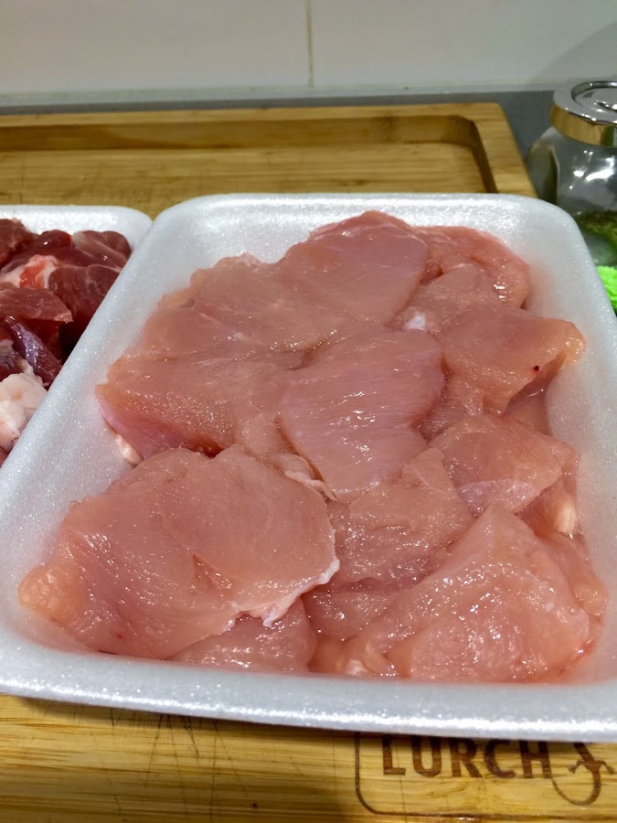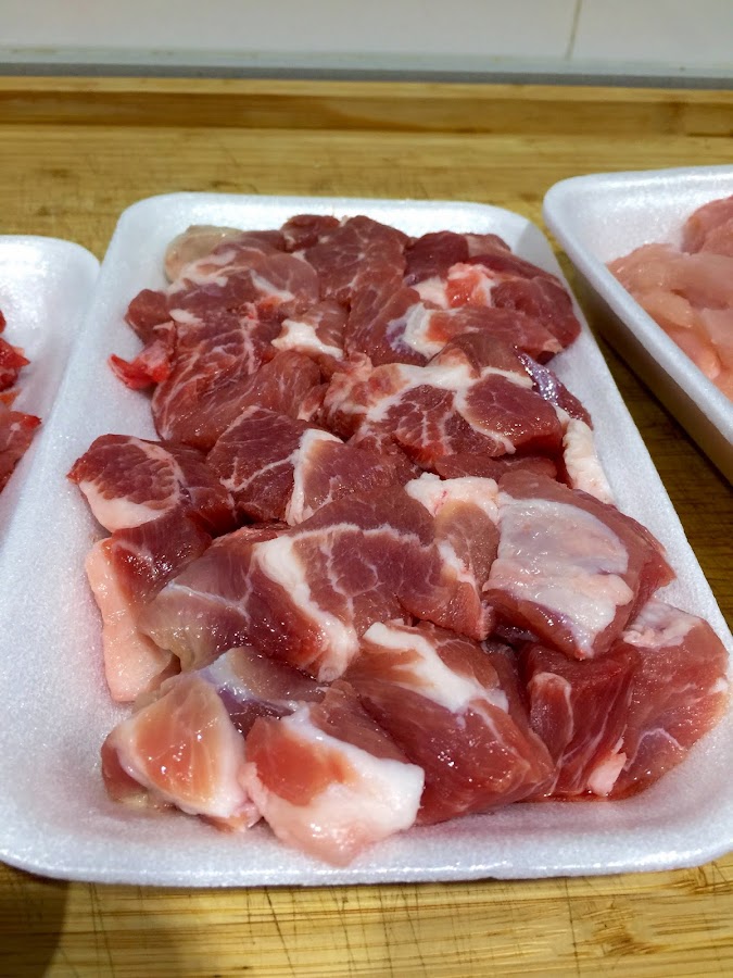 - 500g de carne magra de cerdo o lomo de dos colores