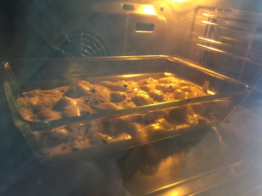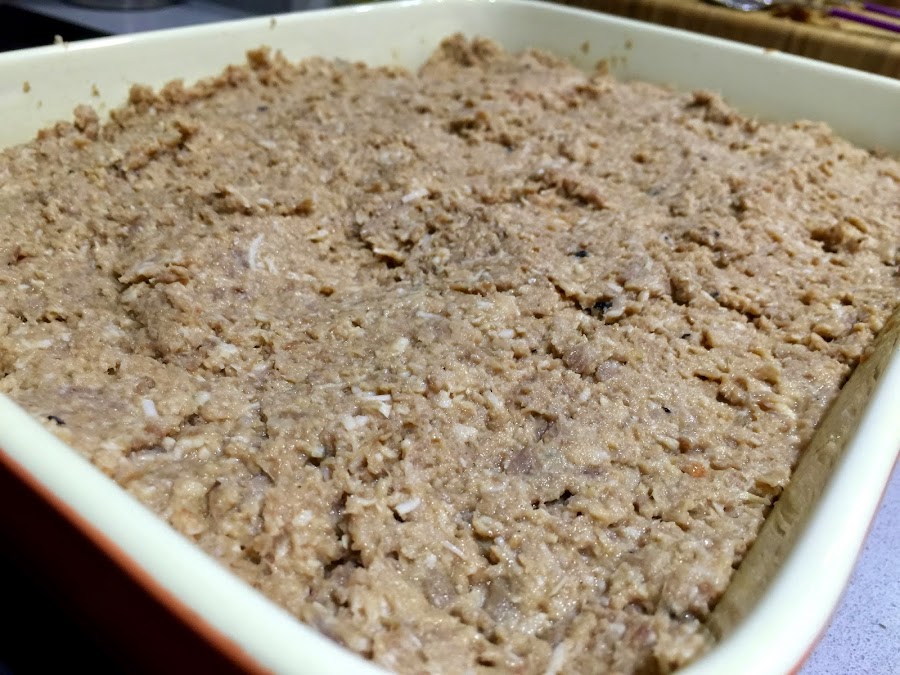 11. Colocamos el relleno en una bandeja. Si lo dejasemos tal cual, estaría buenísimo, pero algo seco. Así que le añadimos un vaso de caldo de pollo, que hará que quede mucho mas jugoso.