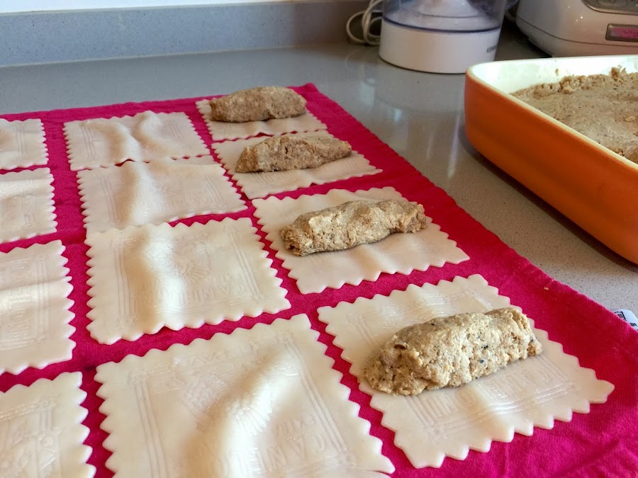 22. Una vez lista la bechamel, empezamos el montaje de los canelones. Ponemos encima de cada placa de pasta, un par de cucharadas del relleno. Le damos forma y lo colocamos en el centro de la pasta, llegando bien hasta los extremos. Enrollamos cada pasta sobre si misma.