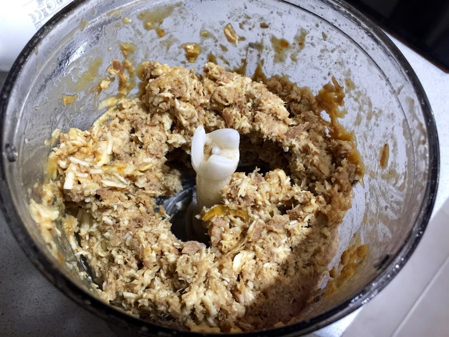 10. Cogemos la picadora y vamos picando el rustido. Ir haciendo tandas, e ir removiendo con la cuchara para que todo el relleno quede igual de picado. Yo hice todo en 4 tandas.
