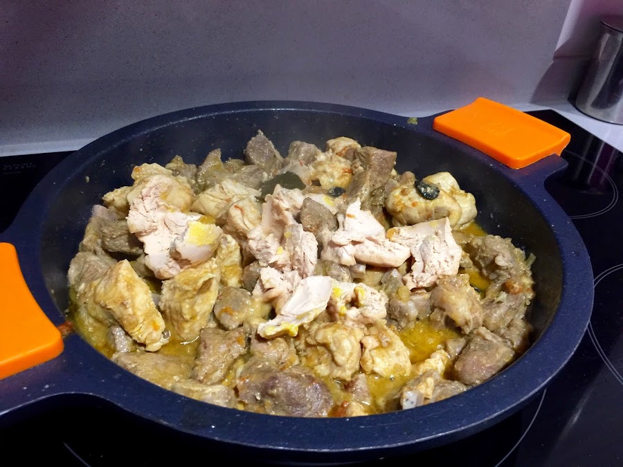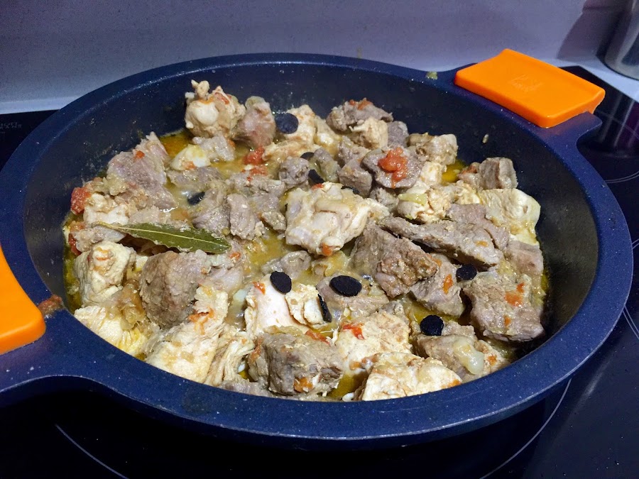 4. Cuando la carne haya tomado color añadimos el medio vaso de vino rancio, subimos el fuego hasta que se evapore bien el alcohol.
