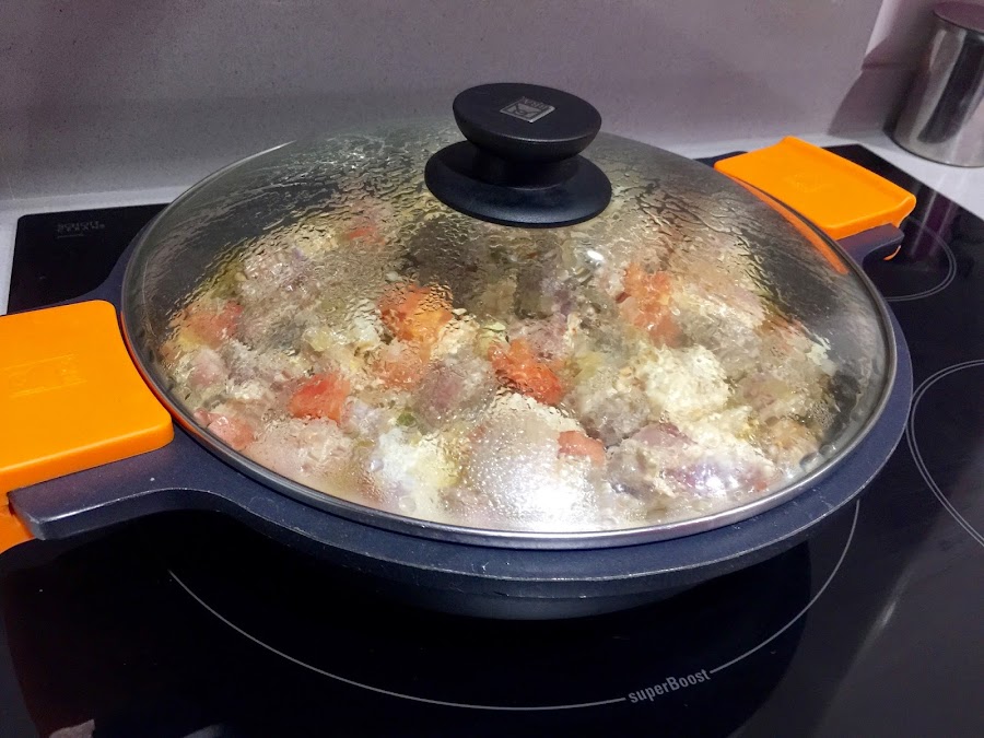 5. A continuación añadimos el tomate troceado, removemos. Bajamos a fuego medio-bajo y dejamos rustir entre 50-60 minutos. Conviene irlo vigilado cada 15-20 minutos.