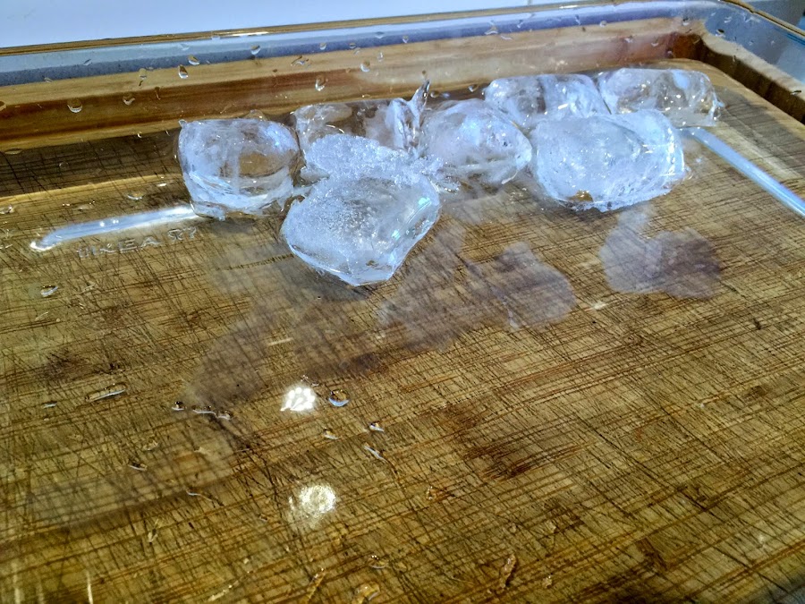 14. Preparamos una bandeja con agua fría y hielo. Cuando la pasta esté lista, con una rasera la iremos poniendo aquí. Dejamos que temple la pasta durante 1 minuto.
