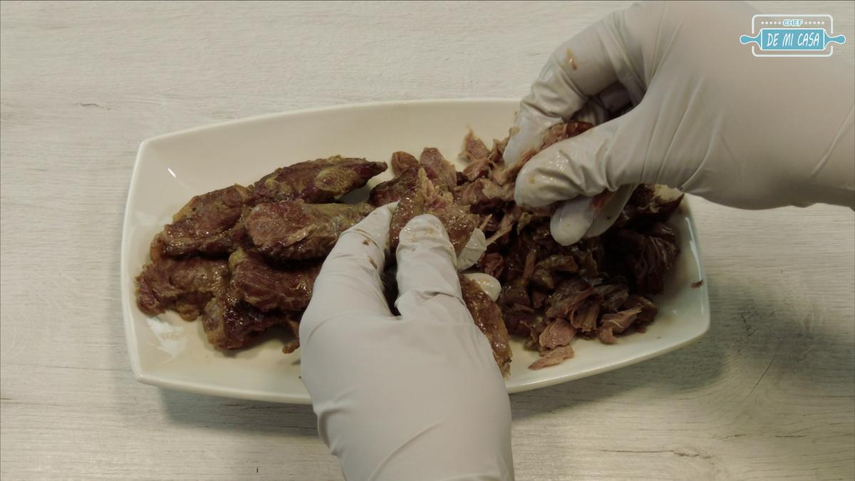 Para cubrir nuestros canelones vamos a necesitar Bechamel y queso rallado. Cogemos las carrilleras y las desmenuzamos. Ponemos la carne ya desmigada en un bol junto con un poquito de la salsa que hemos triturado y un par de cucharadas de bechamel. Mezclamos y metemos en una manga pastelera que vamos a llevar a la nevera para que enfríe bien.