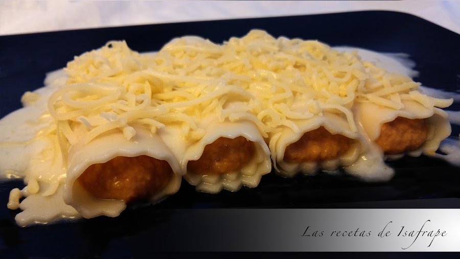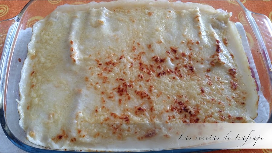 Pasados unos minutos y removiendo con frecuencia la probamos, y si no sabe a harina cruda la volcamos sobre la bandeja con los canelones. Espolvoreamos queso al gusto y horneamos hasta que tenga el punto de gratinado deseado.