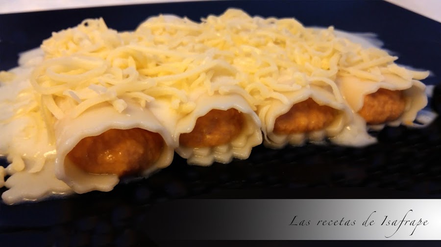 Disponemos un poco del puré sobre el centro del canelón y enrollamos como un canutillo. Los vamos poniendo en una fuente para horno.