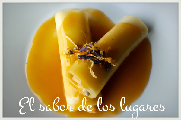 Sirve los canelones con una o dos cucharadas de salsa y decora con pétalos comestibles.