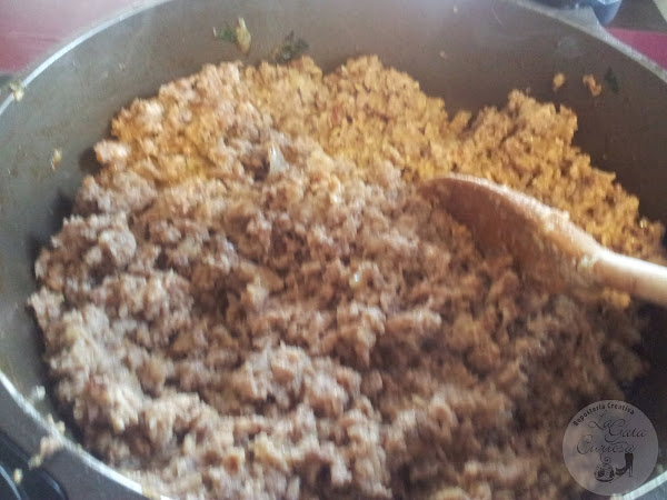 Poner en una sartén grande un poco de aceite (6-8 cucharadas) a calentar, dorar los ajos, cuando los ajos empiecen a tomar color añadimos las cebollas picadas, un poco de sal, tapamos y dejamos pochar al menos 10 minutos a fuego medio-bajo. Pasado este tiempo añadimos la carne, subimos el fuego y cocinamos otros 10 minutos, mezclando de cuando en cuando.