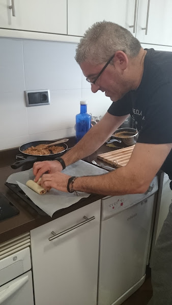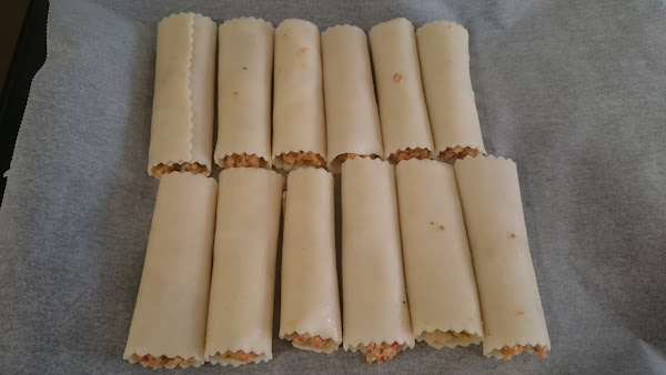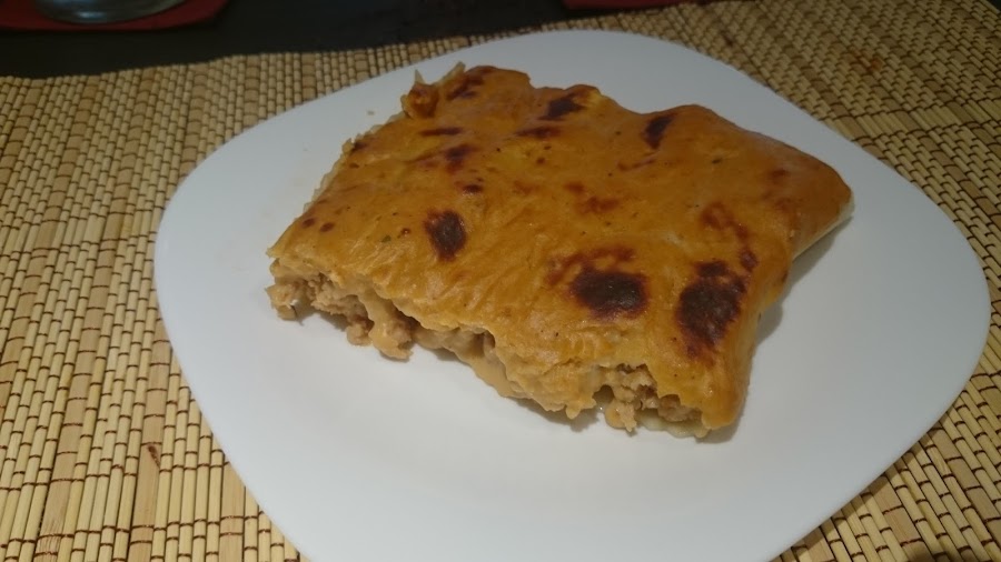 Ahora ya sólo quedará montar los canelones, cogemos una placa y la ponemos extendida en el banco de la cocina o encima de la tabla, cogemos una cuchara y cogemos la mezcla de la carne y ponemos un para de cucharada y enrollamos con cuidado que no se salga nada del relleno por los lados y situamos en un molde para horno que previamente habremos puesto con papel vegetal para que no se nos peguen (si no tenemos papel vegetal untamos el molde con aceite), Así hacemos todo el proceso con todos los canelones hasta que estén situados uno al lado de otro en dos filas más o menos, ahora pondremos la bechamel por encima de los canelones con ayuda de una cuchara extendiéndola por todos los canelones.