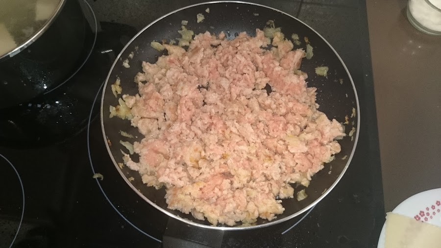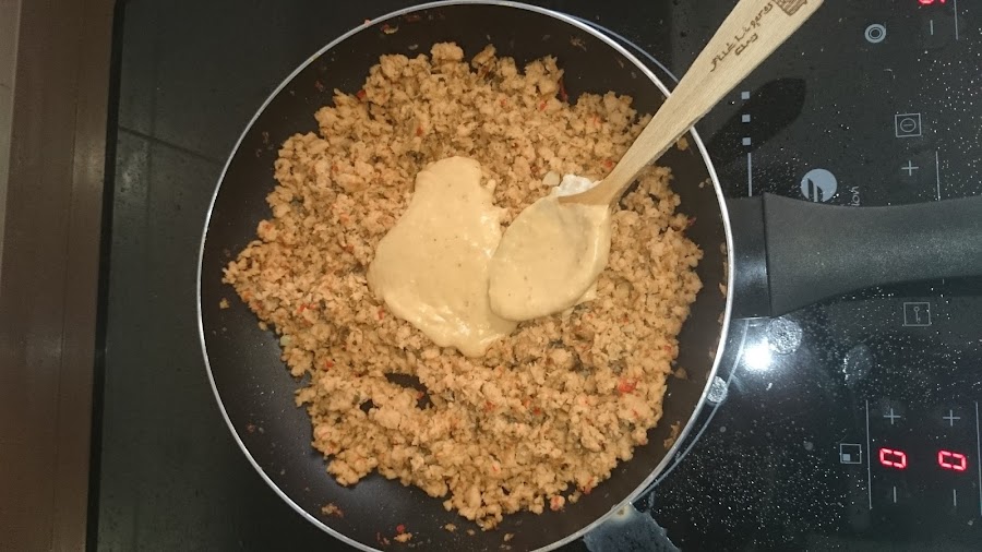 Ahora ponemos dos cucharadas de bechamel con la mexcla de la carne y removemos.