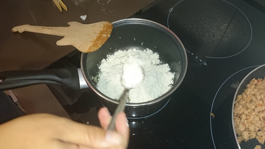 Ahora procederemos a hacer la bechamel, ponemos en un cazo o en una sartén un chorrito de aceite, cuando esté caliente echamos la cebolla rallada y dejamos que se haga la cebolla, a continuación pondremos la harina e iremos removiendo para que no se nos queme, y dejaremos para que se tueste, cuando esté ya tostada echamos la leche y removemos para que no se nos hagan grumos, a continuación ponemos la nuez moscada y removemos, y cuando ya esté todo le echamos una cucharadita de tomate para que le dé sabor y color (a mí personalmente me gustan más así),