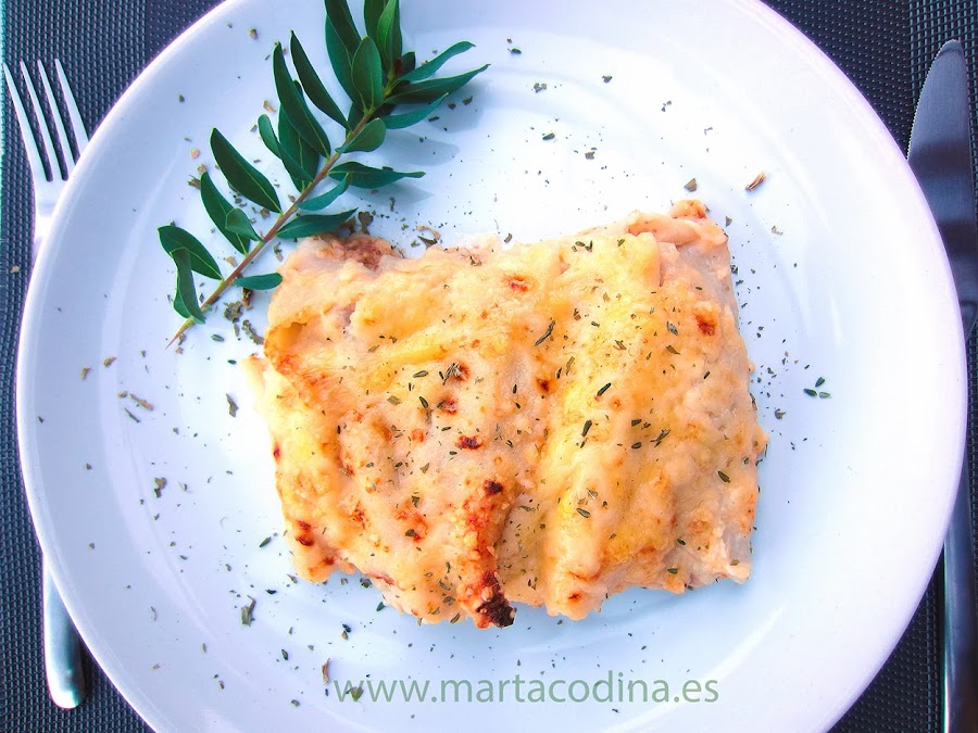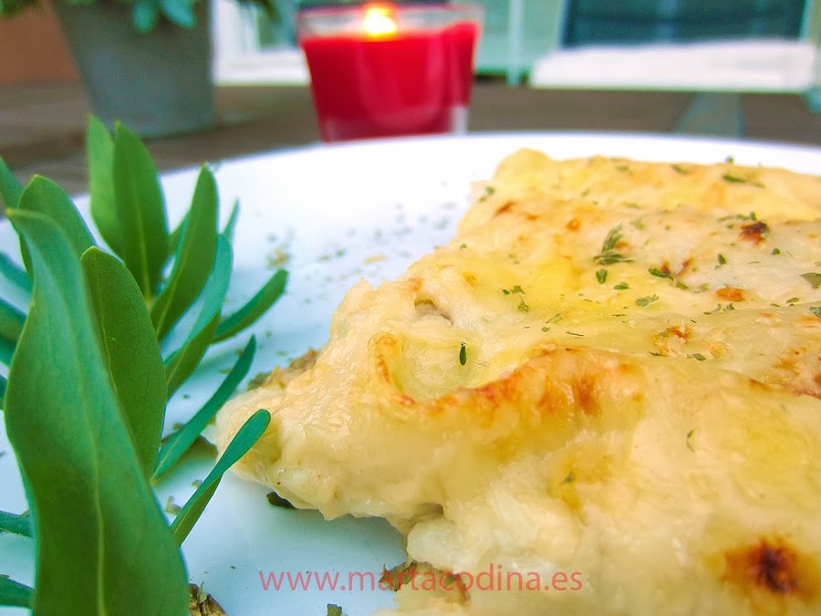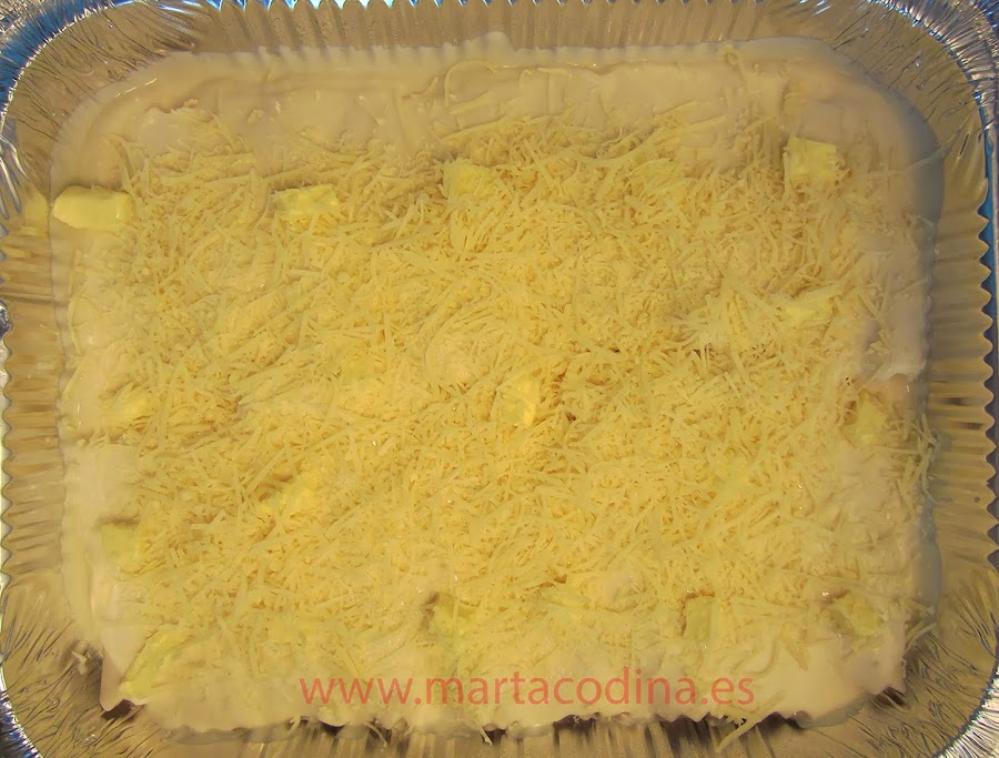Cubrir con bechamel. Espolvorear con queso y trocitos de mantequilla. Diez minutos antes de servir, poner al gratinador.