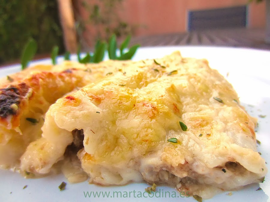 En unas bandejas que puedan ir al horno hacemos una capa fina de bechamel en la base. Disponemos los canelones bien colocados, uno al lado de otro. Acordaros de como los pusisteis porque con la capa de bechamel no los veréis a la hora de emplatar.