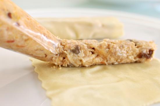 Hervimos la pasta de canelón siguiendo las indicaciones de la caja. También podemos usar los instantáneos, que solo se sumergen en agua caliente. Los disponemos encima de una superficie limpia como si fuera un juego de naipes. Hacemos un agujero a la manga y vamos rellenando los canelones haciendo unos "churros" de extremo a extremo.