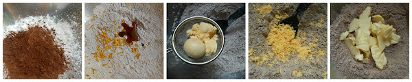 Colocamos en un bol la harina, el azúcar glas, la maicena y el cacao, mezclamos y tamizamos. Añadimos la ralladura de naranja y la esencia de vainilla incorporando bien. Agregamos las yemas de huevo cocidas, pasadas por un colador para que quede muy fina. Mezclamos y por último incorporamos l mantequilla troceada. Unimos bien los ingredientes y volcamos en la encimera (mesada) enharinada, amasando hasta obtener una masa suave que no se pega a los dedos. Aunque nos den ganas de agregar agua, leche o huevo batido no lo hacemos, poco a poco se une bien.