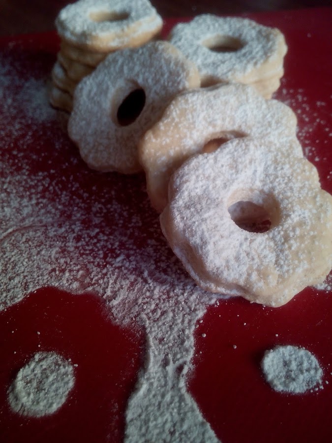 Ahhh los Canestrelli... otra receta que me da batalla, para que el reto sea un reto jajaja. Esta vez me maté con mi propia mano, al ser la anfitriona yo elegí que preparáramos los Canestrelli para la versión dulce. Deliciosos y preciosos, unas galletas con forma de margaritas espolvoreadas con azúcar glas... que belleza. Ahh pero no podía ser una receta que elaborará y ya, no! me dieron batalla! y es que no consideré que estaríamos en pleno verano por aquí y que una masa con tanta mantequilla no se llevaría bien con los 37°C que hacían. La refrigeré y todo bien, pero solo en los pocos minutos de aplanar con el rodillo, cortar y pasar a la placa, se hacía extremadamente suave y muy complicada de manipular, perdían la forma y yo casi lloraba y reía a la vez, recordando que viví exactamente lo mismo (amasar y altas temperaturas) cuando preparé los Cartellate para este mismo reto jajaja.