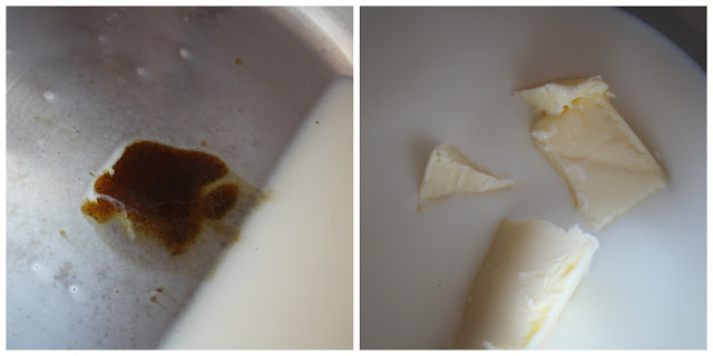 Hervimos la leche con la vaina de la vainilla, previamente abierta (en mi caso utilice pasta de vainilla) y la mantequilla.