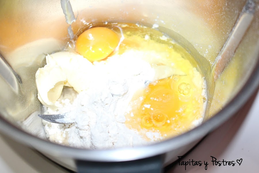 Lavamos y secamos el vaso y ponemos el resto de los ingredientes: harina, mantequilla, yema y huevos completos y anís. Mezclamos bien 30 segundos a velocidad 6.