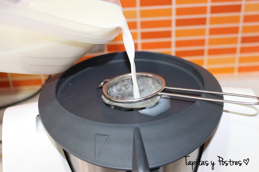 Bajamos los restos de vaso hacia abajo y ponemos a funcionar la máquina a velocidad 2. Colocamos un colador en el bocal y vamos añadiendo la leche poco a poco.