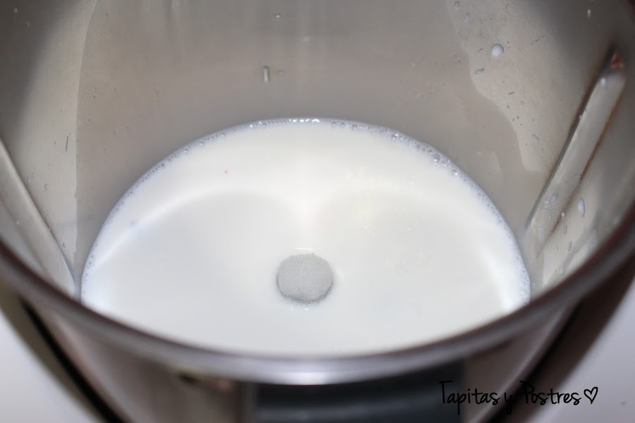 En el vaso de la thermomix ponemos la leche, el azúcar, la vaina de vainilla o el azúcar vainillado. Programamos 7 minutos, 90º velocidad 2. Sacamos y dejamos entibiar.