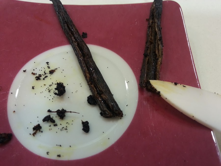 1. - Lo primero es sacar las semillas de la vainilla, cortándolas a lo largo y raspando con el cuchillo.