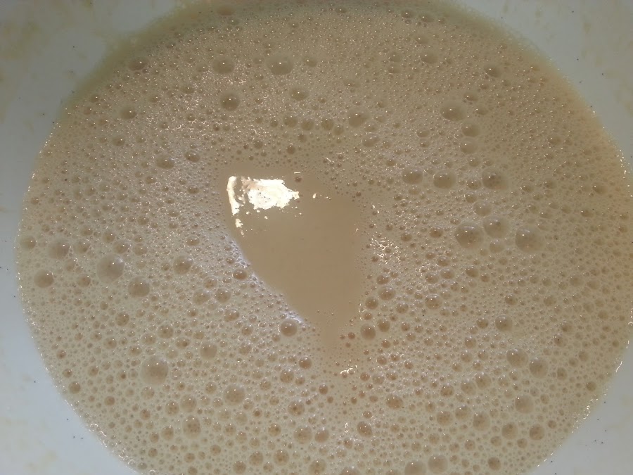3. - Batimos en un bol las yemas con el huevo, el azúcar y cuando la leche esté templada, la añadimos junto con la harina, la sal y el ron, y batimos hasta que quede homogénea. El aspecto es como la masa de los crepes. Metemos en la nevera hasta mañana.