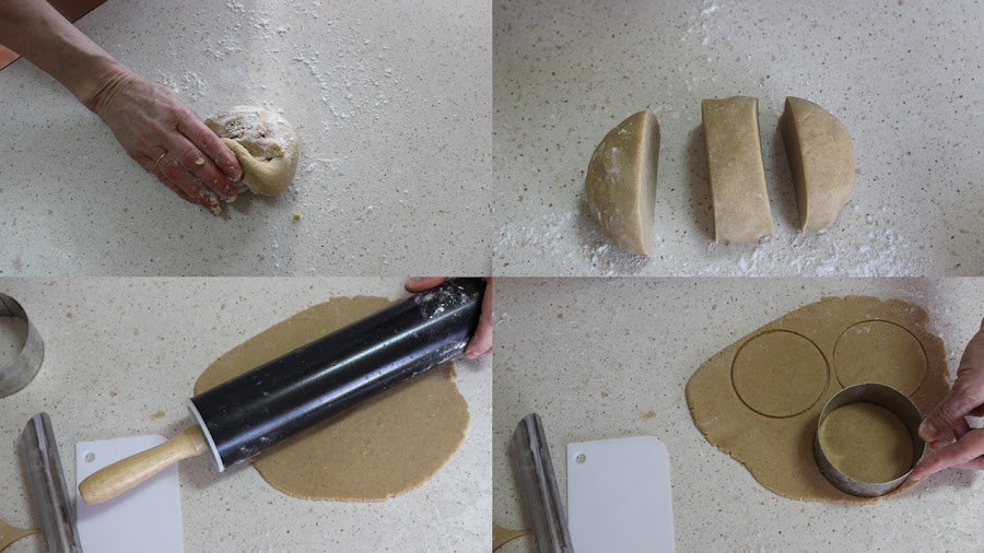 Pasada la hora de reposo, sacamos la masa y la dividimos en tres trozos iguales, la vamos estirando muy finita con el rodillo hasta que tenga 3 mm de grosor. Cortamos círculos de unos 10cm de diámetro.