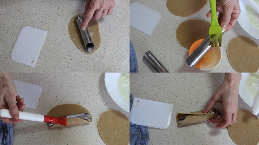 Los estiramos en forma ovalada al tamaño de los canutillos, los enrollamos en los moldes, éstos deberán estar untados con aceite de girasol o mantequilla, pintamos los bordes donde se juntan con un poco de clara de huevo batida para que se peguen bien .