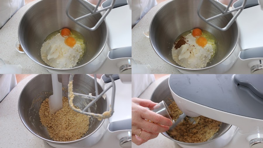 En un bol o en la cubeta de la amasadora ponemos las harinas, el azúcar, añadimos la manteca de cerdo, el huevo y la yema, las especias y amasamos, saldrá una masa arenosa.