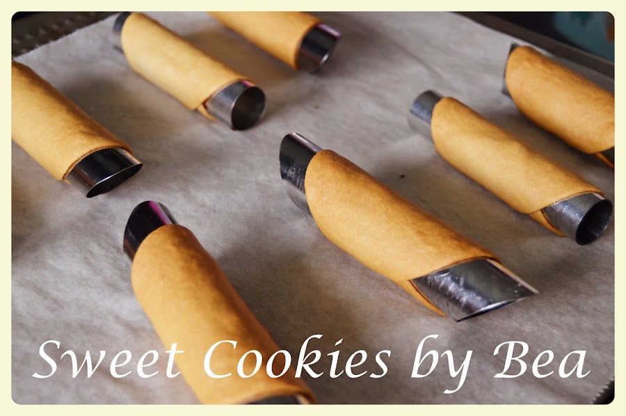 Una vez lista la masa la alisamos con un rodillo y cortamos con un cortador redondo, ponemos nuestros redondeles de masa en los tubitos de metal y horneamos durante 13 minutos a 180ºC, ya sabéis que los tiempos dependen de nuestros horno y como nos gusten de tostados. Yo los saqué así que me gustan tostaditos.