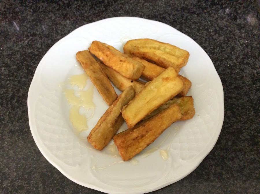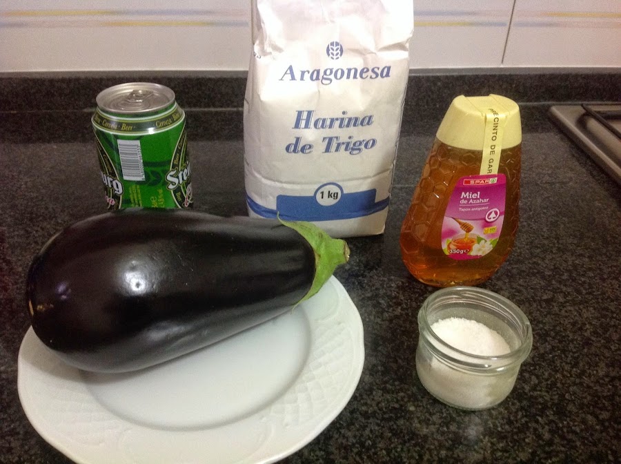 Lo primero que haremos será pelar las berenjenas y cortarlas en forma de prismas rectangulares, lo que llamamos cantones; estos los introducimos en un recipiente para a continuación cubrirlos con cerveza donde deben permanecer más de 15 minutos, después escurrimos las berenjena y las pasaremos por harina; para ello un sistema sencillo es el siguiente: en una bolsa transparente ponemos harina y luego introducimos las berenjenas escurridas, las movemos por el interior y ya las tenernos listas, pero para que no quede harina sobrante las pasamos por un colador para separar el sobrante de harina.