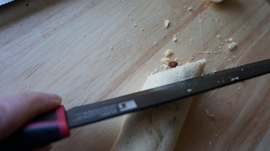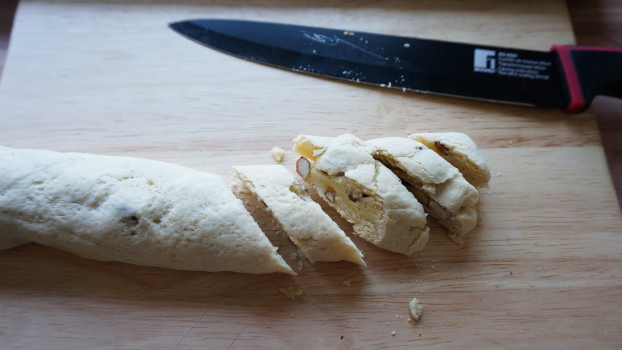 Deja enfriar un poco y corta en diagonal, de 1 cm mas o menos. El cuchillo tiene que ser bien filoso, y cortar de un golpe seco para romper las almendras de forma limpia y que no se desarme, ( ver el video si no entiendes esto)