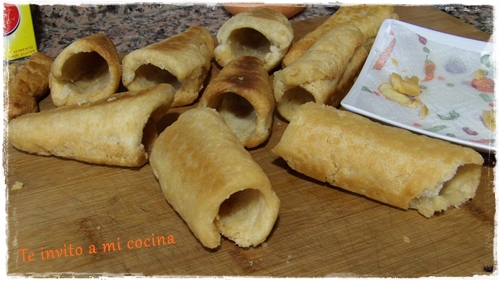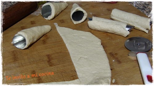 Ahora vamos estirando la masa y cubriendo los moldes para los canutillos. Estos de pueden comprar en ferreterías o bazares.Cuanto mas fina nos quede la masa, sin que llegue a romperse, mejor.
