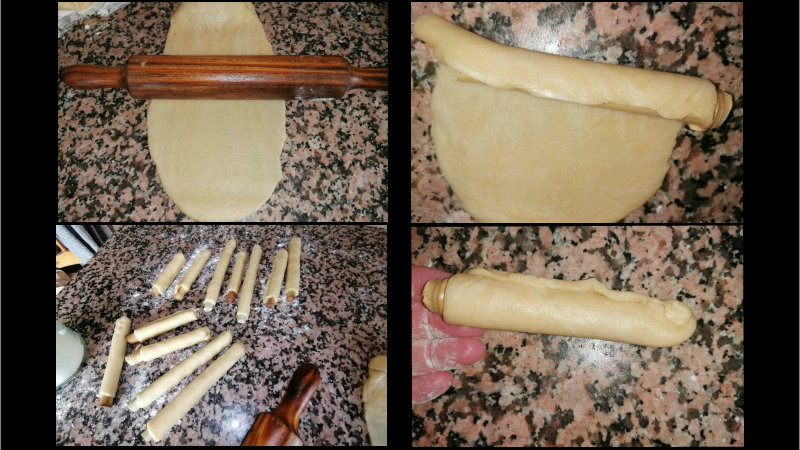Después de dejar reposar la masa, pasamos a formar los canutillos, para ello con ayuda del rodillo de cocina estiramos, (cuanto más fino mejor) y vamos enrollando las cañas de bambú o moldes, lo que tengáis