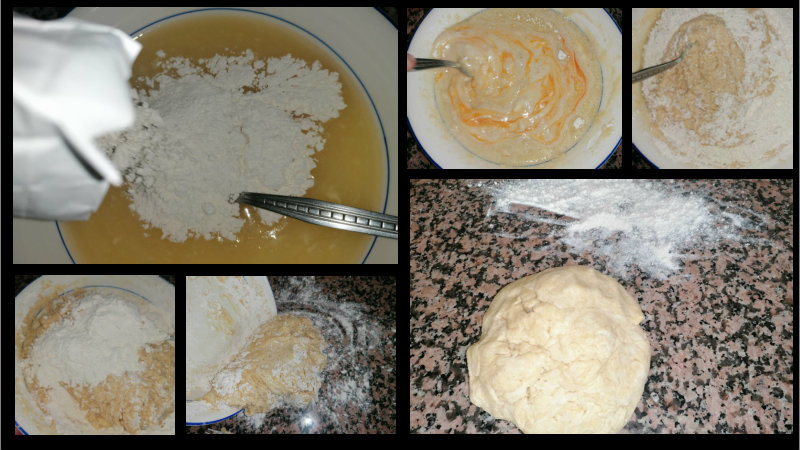 Primero hacemos la masa, mezclamos los líquidos, añadimos la levadura química (opcional), el sal, la yema de huevo y la mantequilla derretida, luego vamos incorporando la harina, hasta formar una masa que podamos amasar, pasamos a encima de la mesa y amasamos bien, cuando la masa no se nos pegue a las manos estará lista, dejamos reposar 2 horas tapada con un paño en la nevera