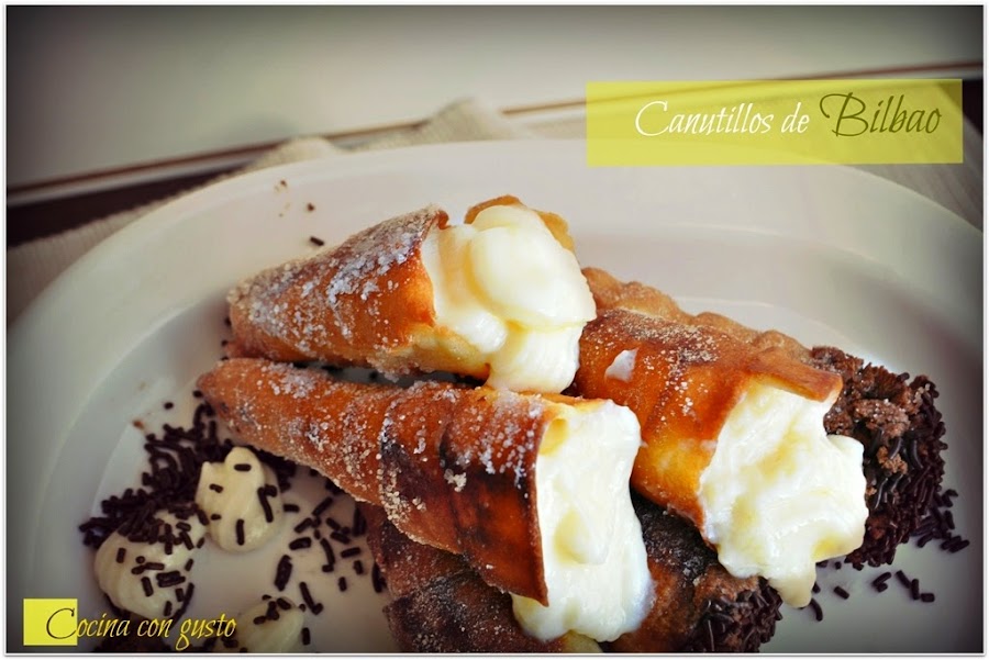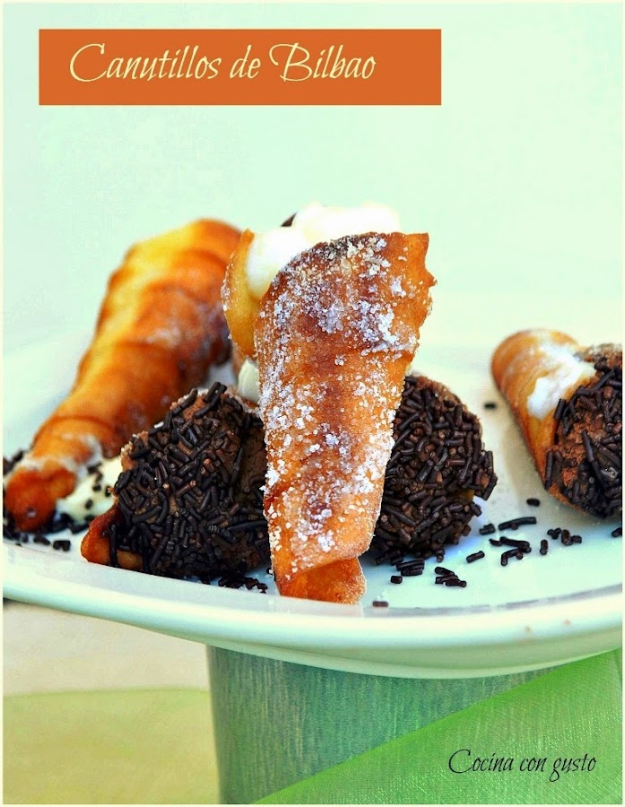 Al final me he decidido por estos ricos canutillos rellenos de Bilbao que aunque se suelen hacer de hojaldre, también está la versión de hacer la masa casera, que es la que he hecho yo.