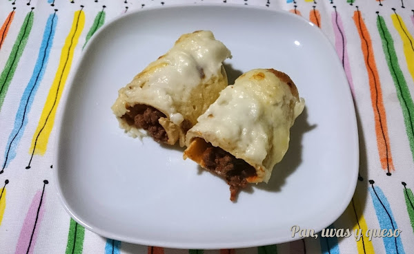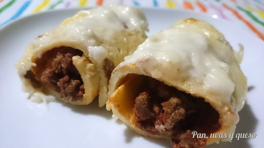 Cogemos una de las tortillas, echamos carne en el medio y la enrrollamos como un canelón. Repetimos con el resto de las tortillas. Colocamos los canutillos en una fuente apta para el horno.