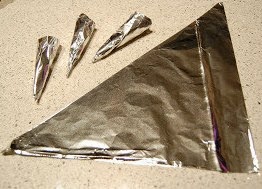 Para hacer los moldes, hacemos un cuadrado con el papel de aluminio y lo doblamos de esquina a esquina tres veces, hasta que nos queda un triángulo más pequeño. os aconsejo que rellenéis el triángulo con un poco de papel de aluminio para que al poner las tiras de hojaldre no se os aplaste el molde.