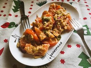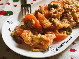 – Añadimos los tomates a gajos, la cebolla en juliana, el atún, las alcaparras, orégano y salpimentar.