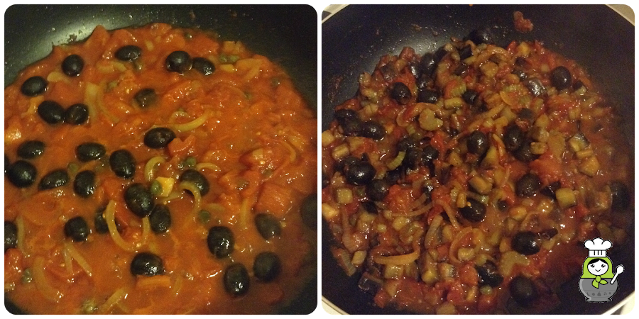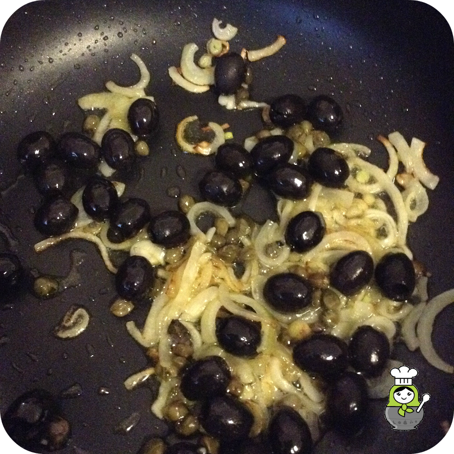 Cortamos la cebolla en rodajas finas y la pochamos en una sartén grande con 2 cucharadas de aceite. Cuando esté transparente y blandita, añadimos las alcaparras escurridas y las aceitunas (sin hueso). Dejamos todo a fuego bajo durante unos 5 minutos.