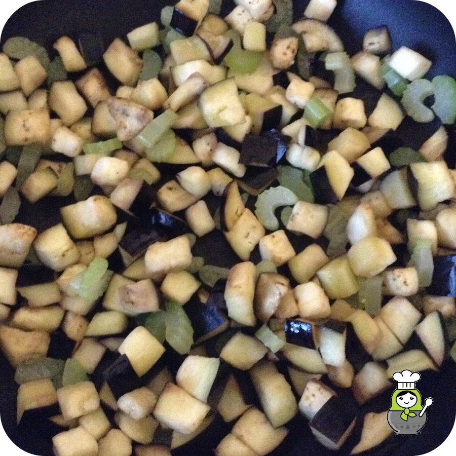 Mientras el tomate se hace, en otra sartén, con una cucharada de aceite, salteamos el apio y la berenjena durante unos 5 minutos.
