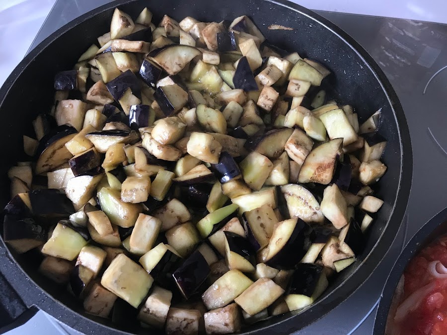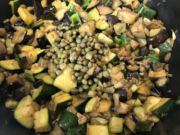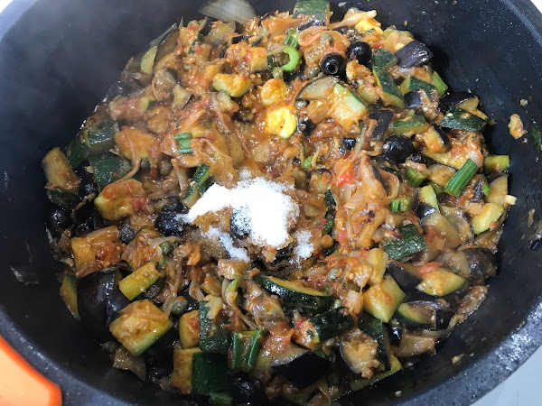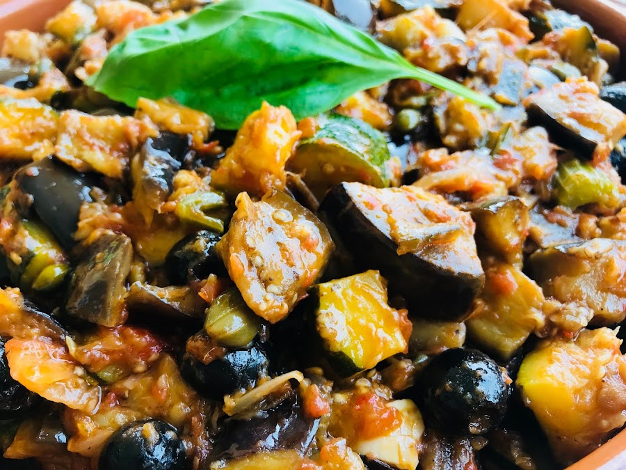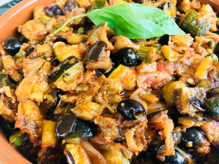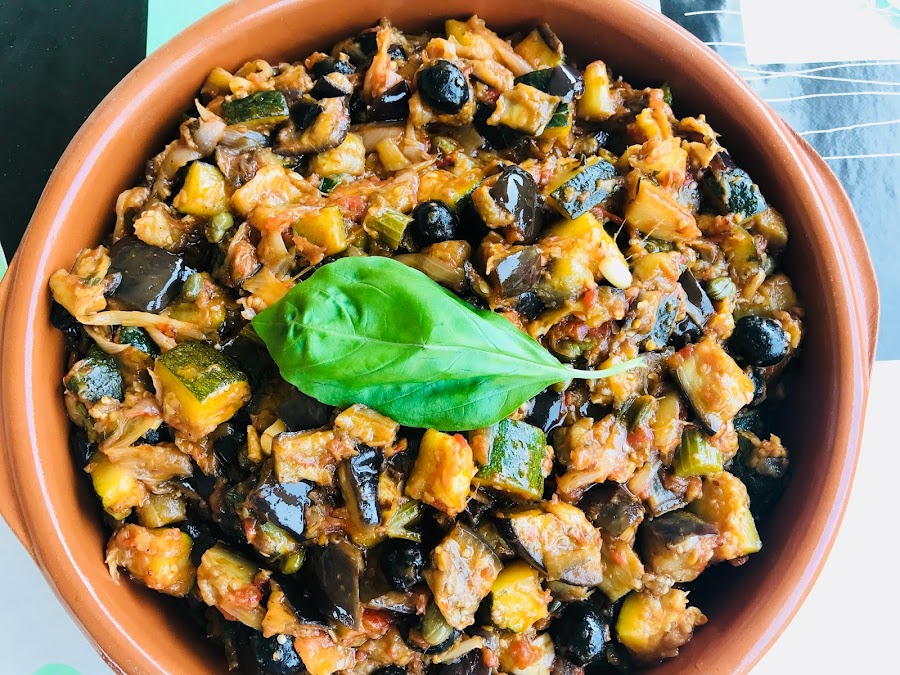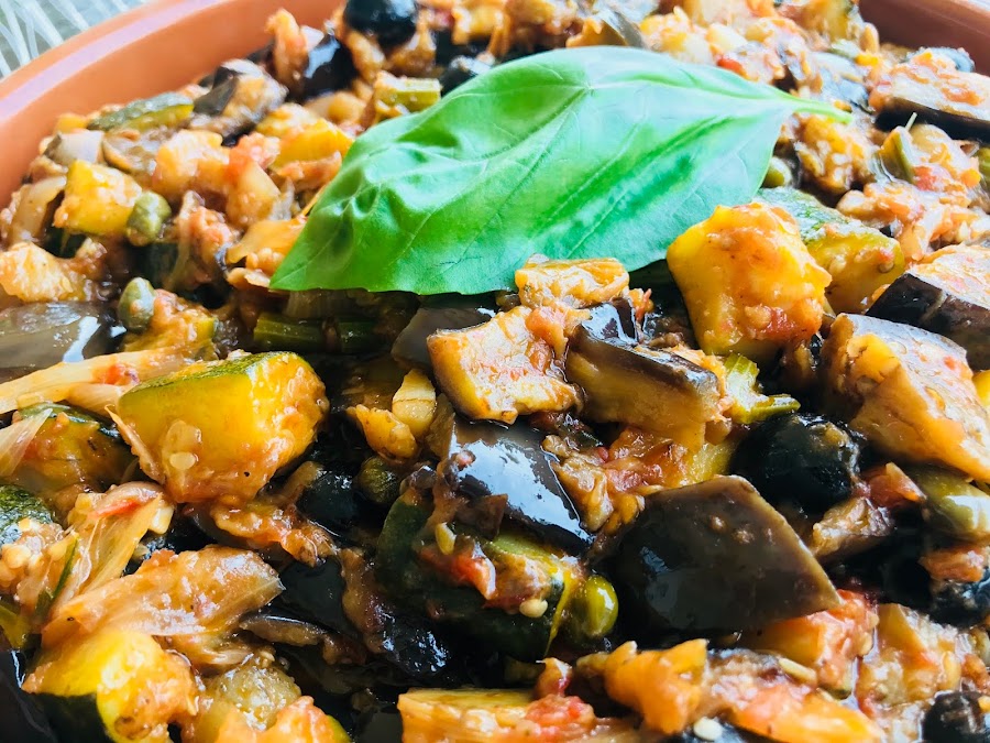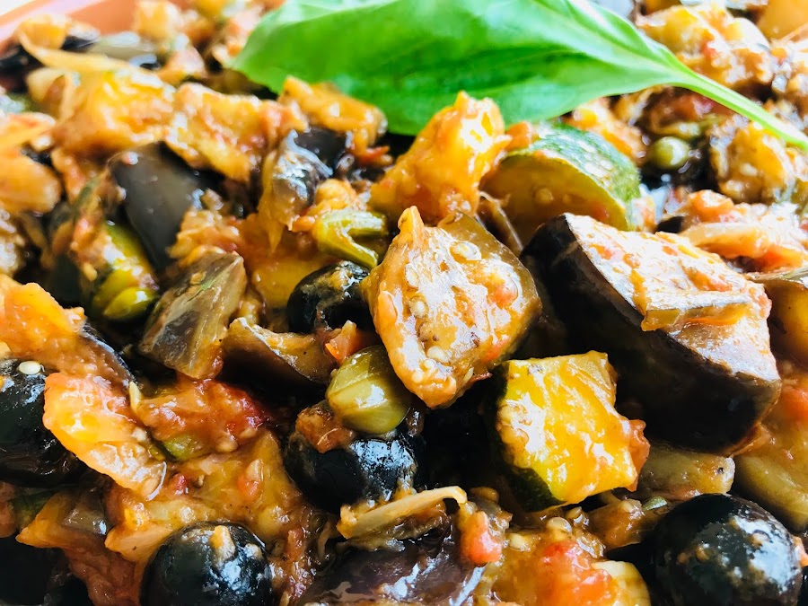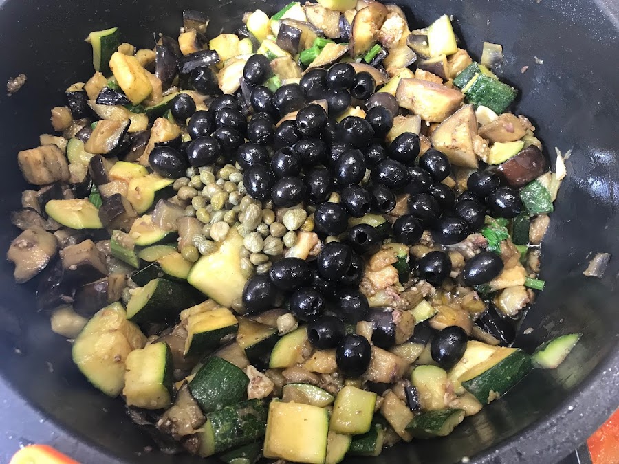 Hoy realizaremos un estofado de berenjena o una caponata, la caponata es típica de Sicilia, yo he incluido unos ingredientes más, calabacín y también anchoas.