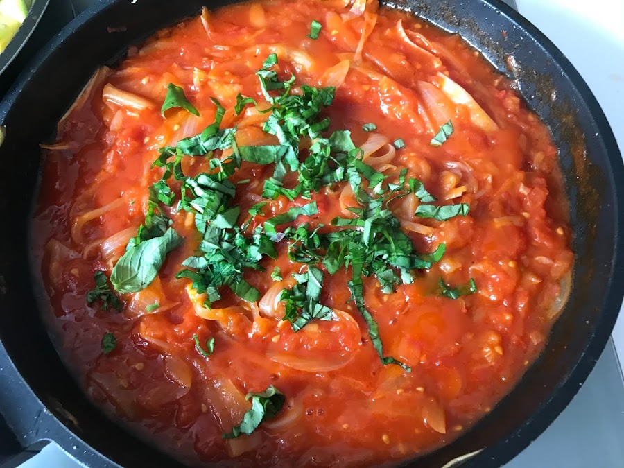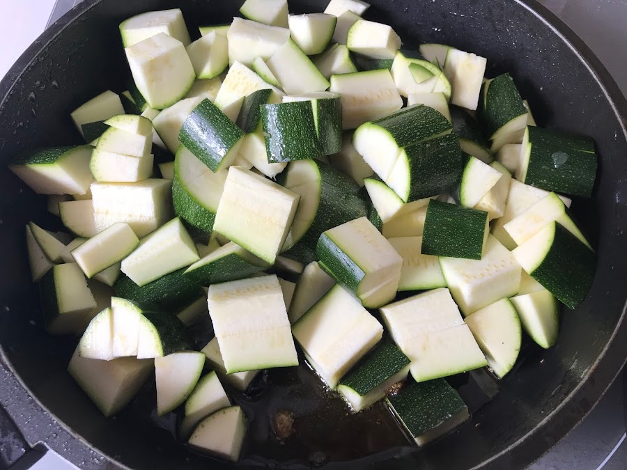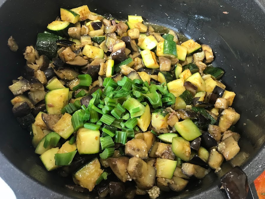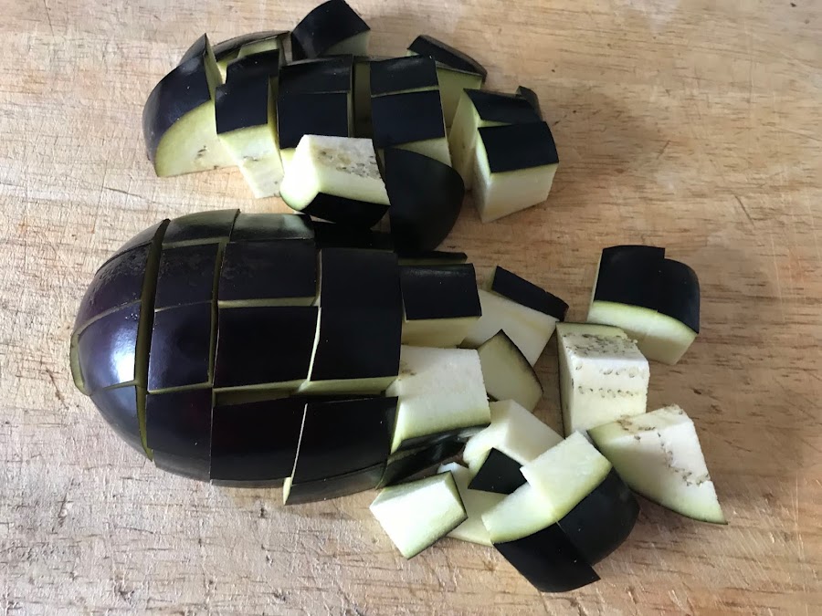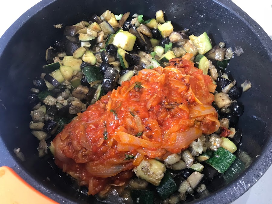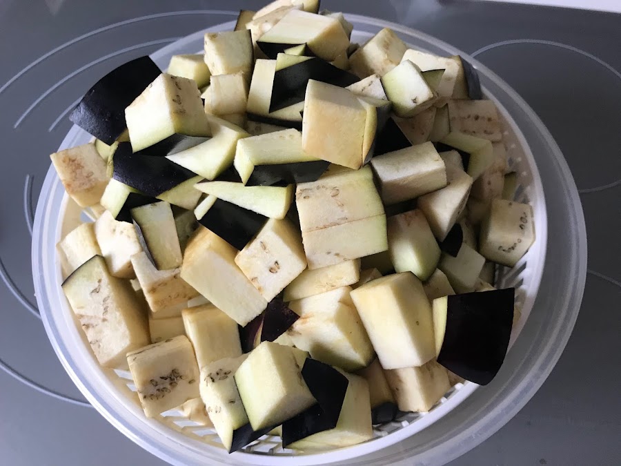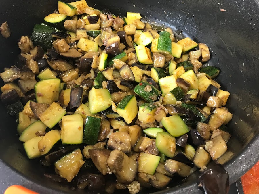 Hoy realizaremos un estofado de berenjena o una caponata, la caponata es típica de Sicilia, yo he incluido unos ingredientes más, calabacín y también anchoas.