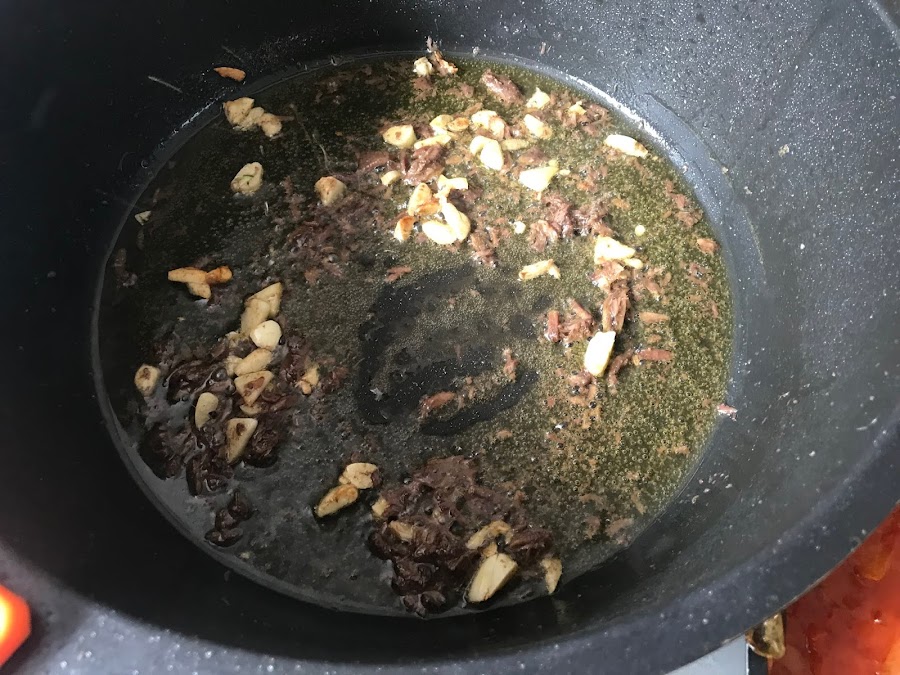 Una vez los ajos están dorados incorporamos los filetes de anchoa y movemos hasta que se quede una pasta.