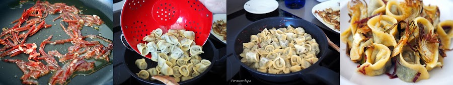 Cortar dos o tres lonchas de jamón serrano (cuanto más bueno mejor sabrá) en tiritas finas. Freírlas ligeramente en un sartén con 3 cucharadas del aceite de las alcachofas y añadir a continuación los cappelletti, darles dos o tres vueltas con cuidado para que cojan el sabor del aceite y servir rápidamente para que no se enfríen.