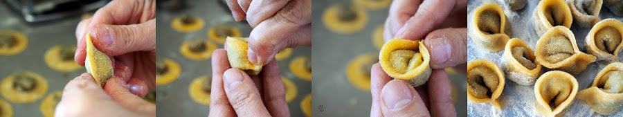 Humedecer con un poco de agua el borde exterior y plegarla por la mitad para hacer medias lunas. llevar las puntas hacia el centro y presionar para unirlas: listo el cappelletti. Espolvorear con semolina para que no se peguen entre si.
