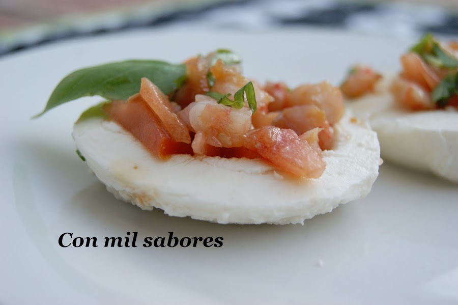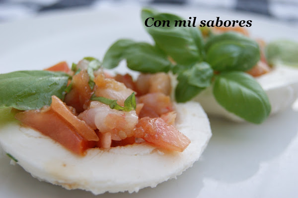 Cortamos las bolas de queso mozarella por la mitad formando dos semicircunsferencias, vaciamos con una vaciador de frutas el centro del queso mozarella sin llegar al fondo y rellenamos el hueco con el tartar de langostinos que hemos preparado. La mezcla de queso mozarella con el relleno resulta delicioso. Buen provecho amigos!!!!