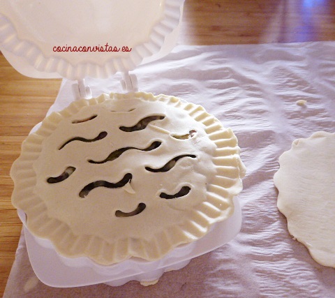 Sobre la base de la empanada ponemos una cuarta parte de nuestro relleno y cubrimos con la otra parte de la empanada.